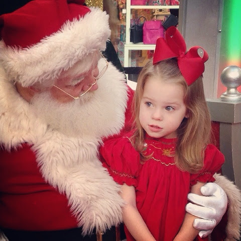 Ella wasn't nervous at all talking to Santa. She said she wanted a princess castle with an Ariel bathroom and a Tiana kitchen, an Anna and Elsa castle, and a few other things but all were either a princess or a castle. In this picture, Santa was asking if she liked Frozen and her eyes perked up!